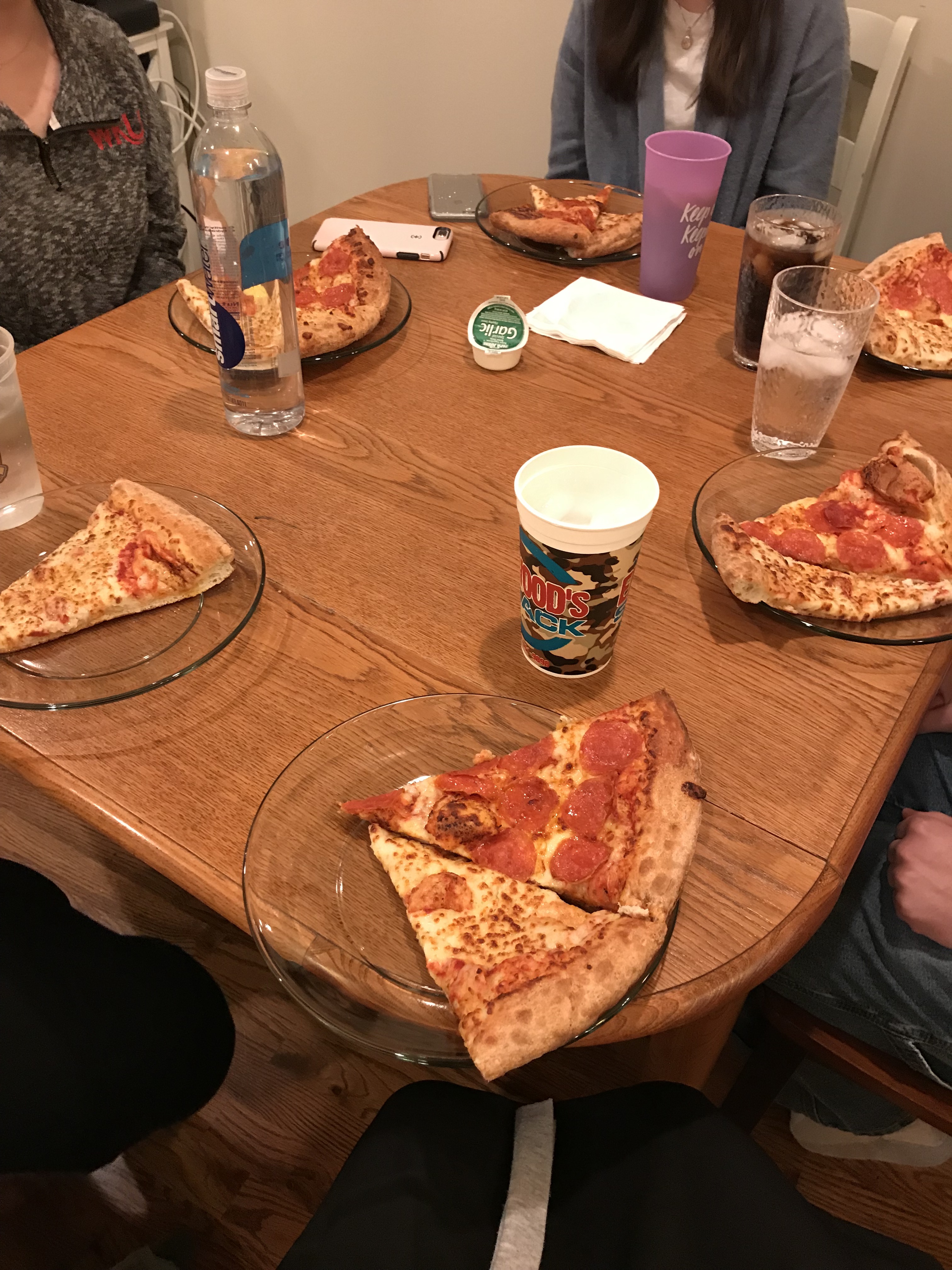 When it came to the meal itself, it was not exactly traditional. Considering that we are all broke college students living in small apartments with little space to cook (or couchhopping with no space), I did not want to require everyone to cook. Instead, we had a very stereotypical college meal. Faith and I both brought a pizza, and Emma and her roommates brought drinks and chips. When we had all arrived, we sat down at Emma’s table, and Blake said a prayer to start off our meal.