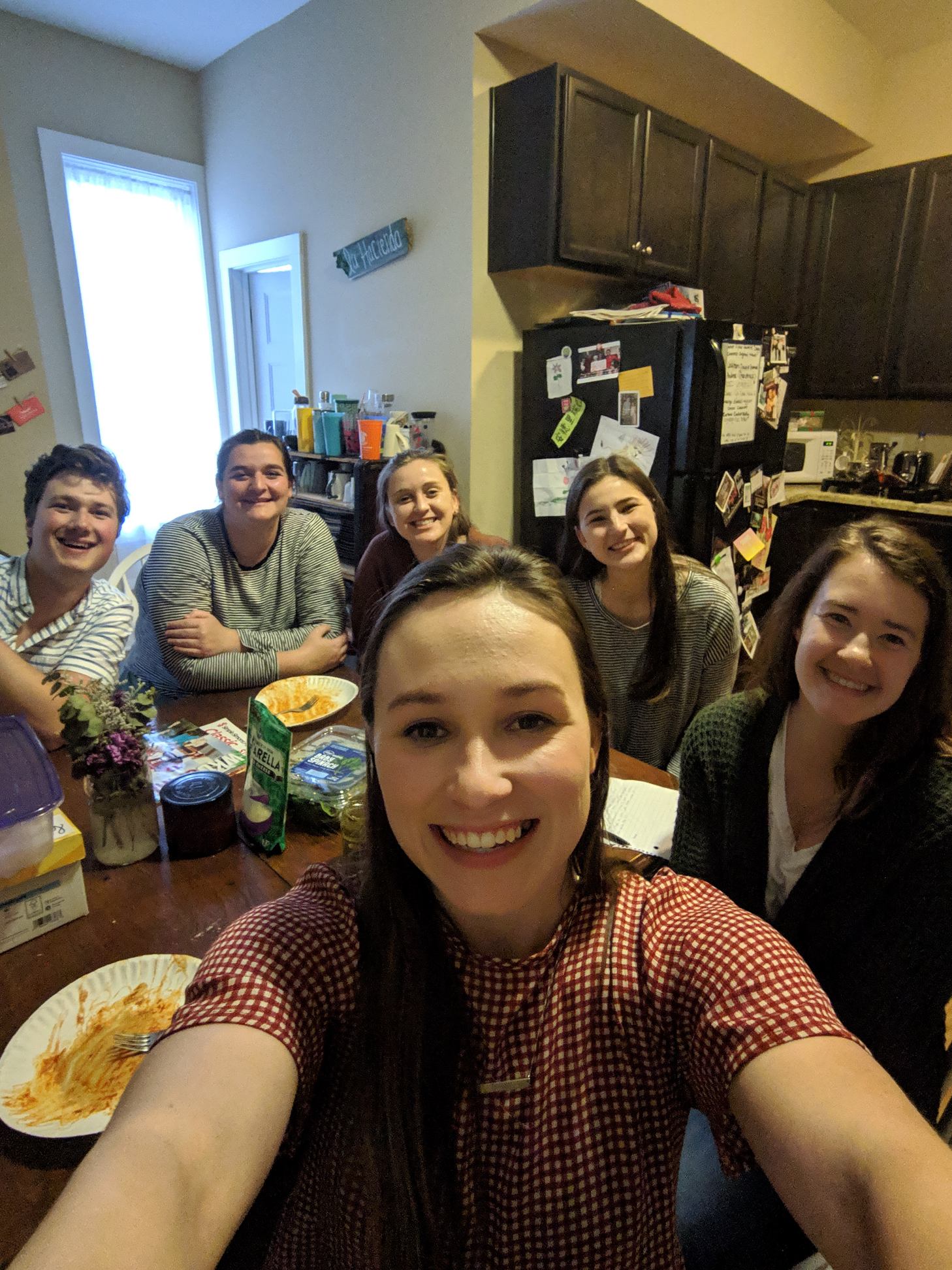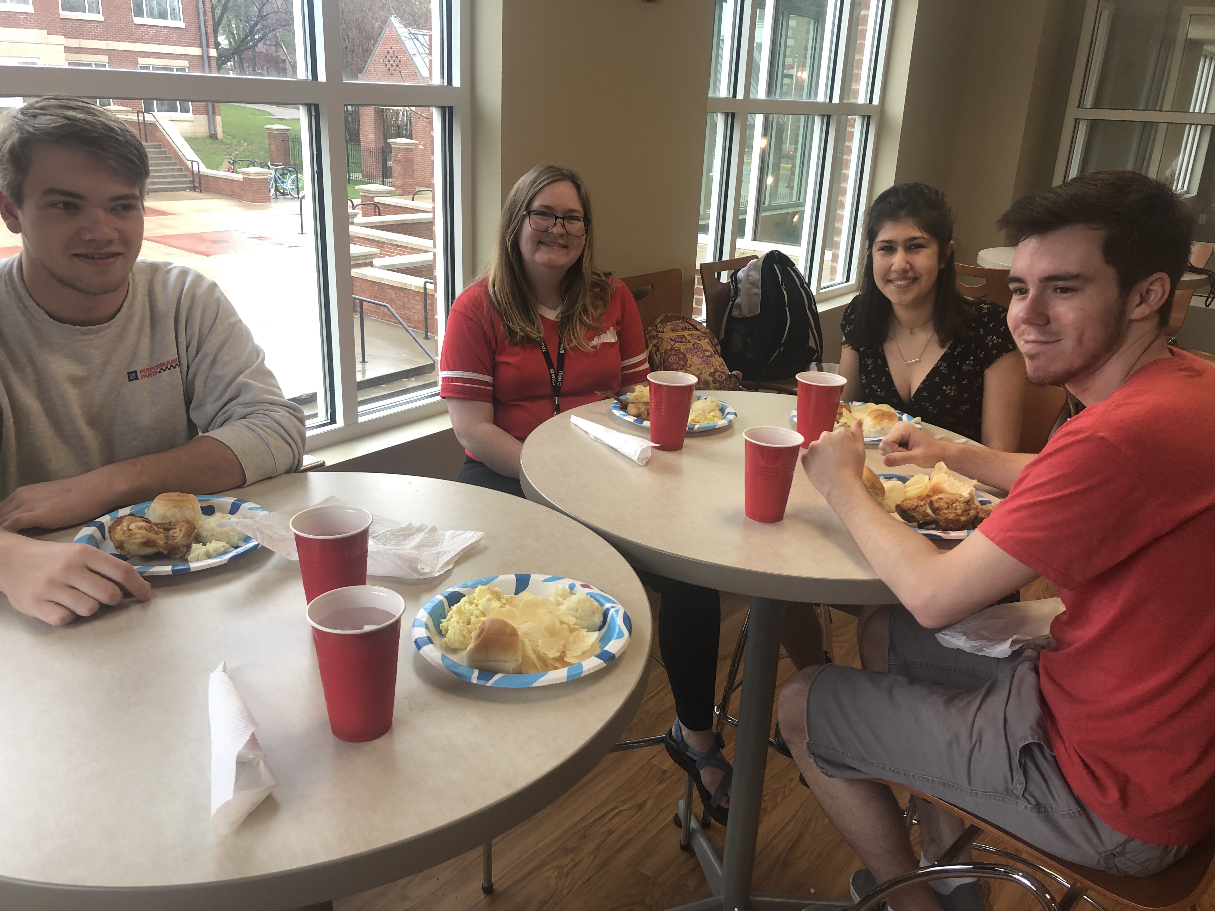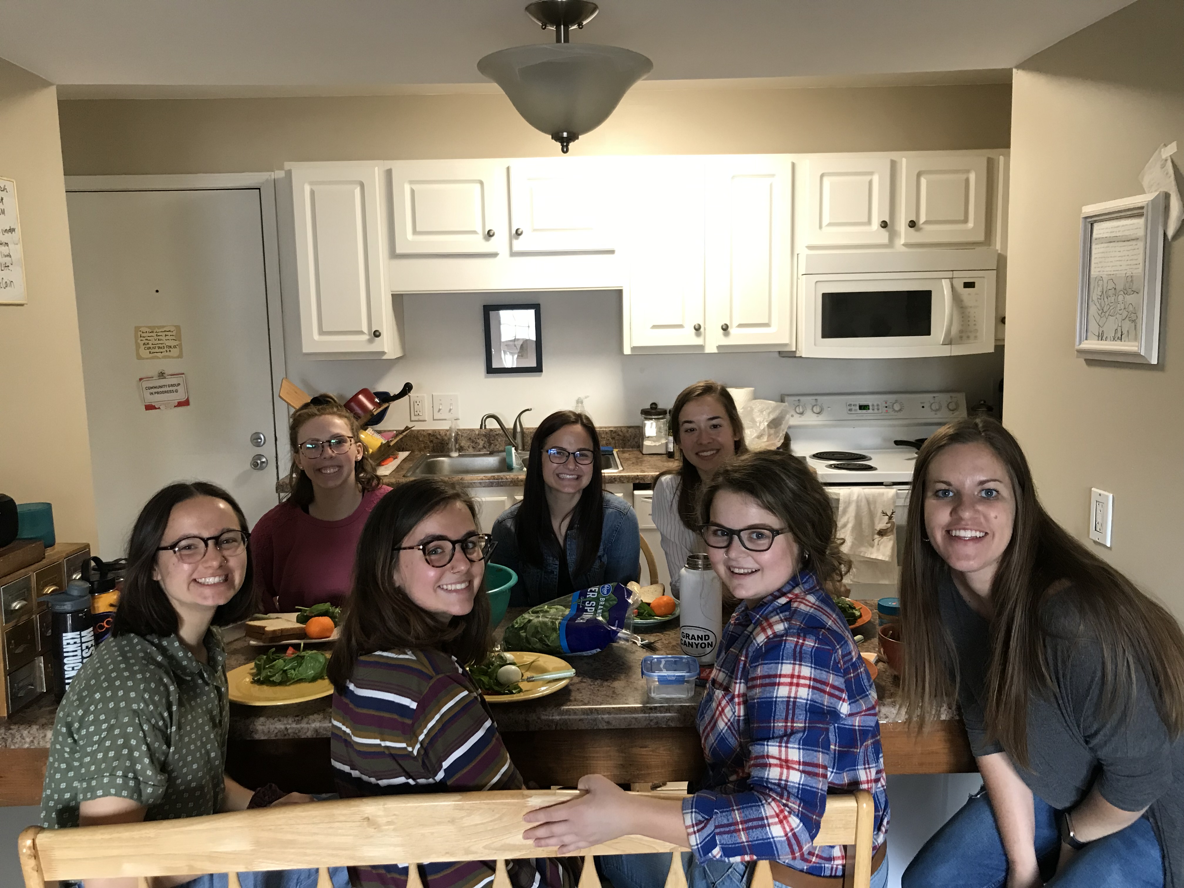 On April 11th, 2019, Bailey, Hayden and I hosted our Kentucky Kitchen Table Dinner in Bowling Green at my older sister’s house. We figured everyone was lacking on getting enough fruits and veggies (college kids). So, we prepared a vegetarian feast of salad, sweet potatoes, peppers, scrambled eggs, and fruit. Joining us was Laura, Logan, Amelia, and Erika. Laura is a sports psychology major from Segovia, Spain and plays on the WKU girls tennis team. Logan is very charismatic and knows how to laugh at himself. He was even kind enough to help me and Hayden prepare dinner. Amelia is a new friend of mine. She is kind-hearted and a great listener. Amelia is majoring in social work- how perfect! I had never met Erika before this dinner, but it turns out she had my mom as a teacher during high school for two years and had heard a lot about me. I’m sure she wanted to run out of the house after realizing I was the crazy kid my mom always talked about, but she remained very polite. Erika is a political science and economics double major. She plans to be a judge one day.